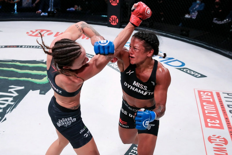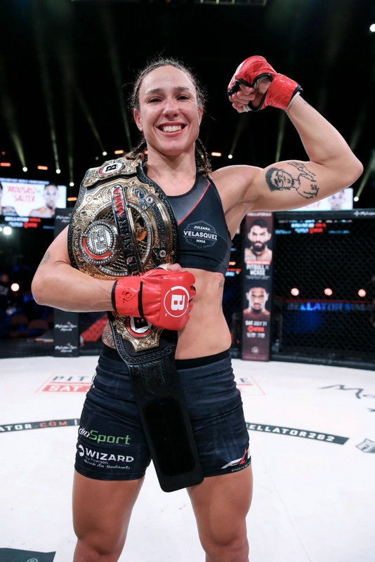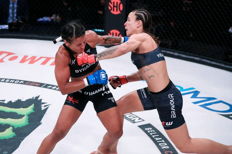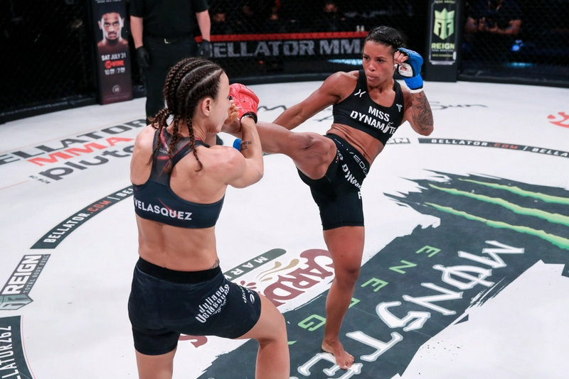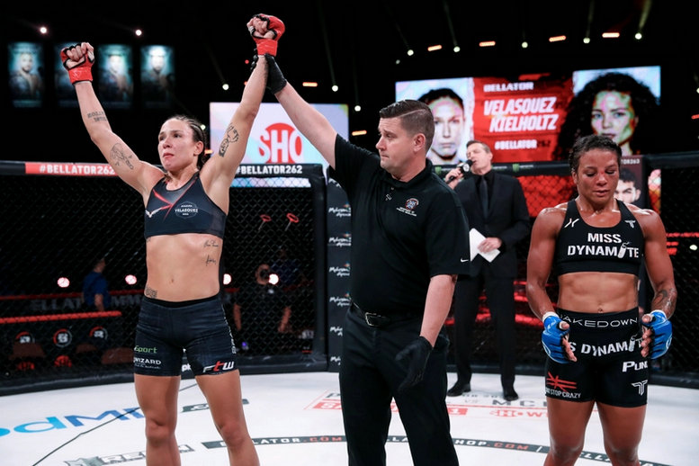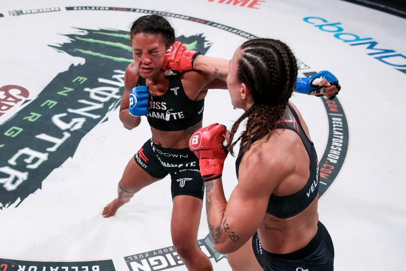 本次的头条主赛是一场Bellator女子蝇量级冠军争霸赛,现任不败冠军巴西女王朱丽安娜·维拉奎兹(Juliana Velasque格斗z)(12-0,4 K,1 S)对阵挑战者荷兰踢拳冠军丹尼斯·基霍茨(Denise Kielholtz)(6-3,2 K,3 S)。虽然基霍茨的MMA战绩看上去一般,但是泰拳出身的她拥有(47-3)的踢拳战UFC绩,获得过Bellator等多个踢拳金腰带实力不可小视。身高臂展略占优势的维拉奎兹稳稳控制距离,第三回合开始慢慢扩大优势,双方基本都在站立对拼,维拉奎兹的打击更胜一筹。最终双方打满五回合,维拉奎兹以(48-47、47-48、48-47)分歧判定获胜,成功卫冕冠军头衔并且继续不败金身。
