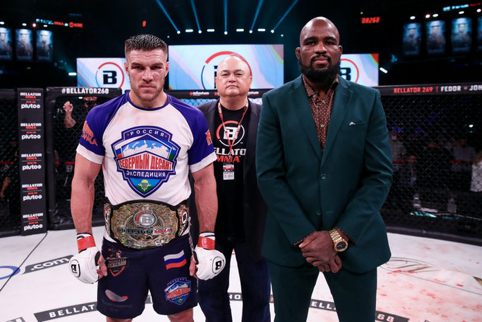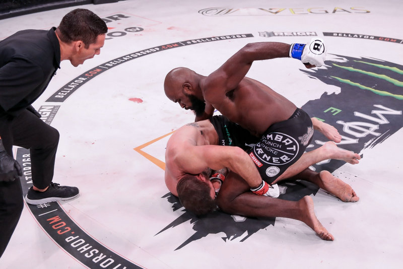 本次的头条主赛是Bellator轻重量级锦标赛的另一场半决赛,同时也是冠军金腰带头衔战,现任冠军瓦迪姆·内姆科夫(Vadim Nemkov)(15-2,11 K,2 S)对阵朱利叶斯·安格利卡斯(Julius Anglicka散打s)(10-2,3 K,4 S)。内姆科夫算是有惊无险,第一回合被安格利卡斯重拳击倒了一次,不过内姆科夫马上利用抱摔成功恢复过来。之后的几回合内姆科夫都频频使用摔法地面压制优势明显,安格利卡斯在地面缠斗的技术明显欠缺许多,最终在第四回合4分25秒内姆科夫使用木村锁降服获胜,成功卫冕冠军金腰带并顺利晋级锦标赛的总决赛。