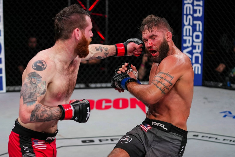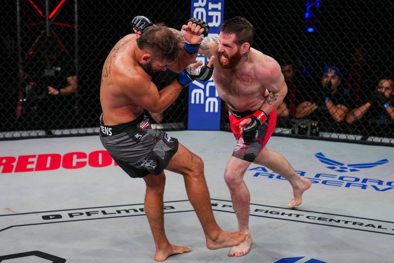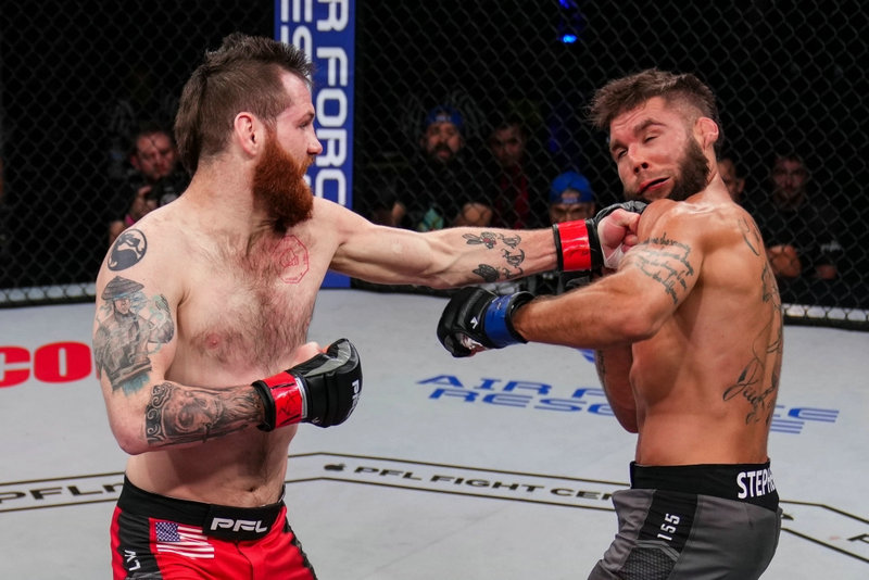 本次的头条主赛是前UFC名将杰里米·斯蒂芬斯(Jeremy Stephens)(28-20,19 K,2 S,1 N)的PFL首秀之战,他将对阵另一位前UFC选手克莱·科拉德(Clay Collard)(21-9,10 K,3 S,1 N)。第一回合斯蒂芬斯重拳重腿非常强势,不过科拉德马上适应了对方的打击,随后科拉德连续输出打的斯蒂芬斯有些措手不及。第二局双方火力全开,科拉德抗击打很强丝毫不在乎斯蒂芬斯的进攻,这一回合双方拼的非MMA常凶狠都消耗不少体力。第三局斯蒂芬斯已经没有太多体力,双方的攻势有所降低。最终双方打满三回合,科拉德三局都更胜一筹,最终以(30–27、30–27、30–27)的点数一致判定完胜。值得一提的是,科拉德在去年4月的比赛上,对阵同样是PFL首秀的前UFC轻量级冠军安东尼·佩蒂斯(Anthony Pettis),也是让佩蒂斯点数告负。