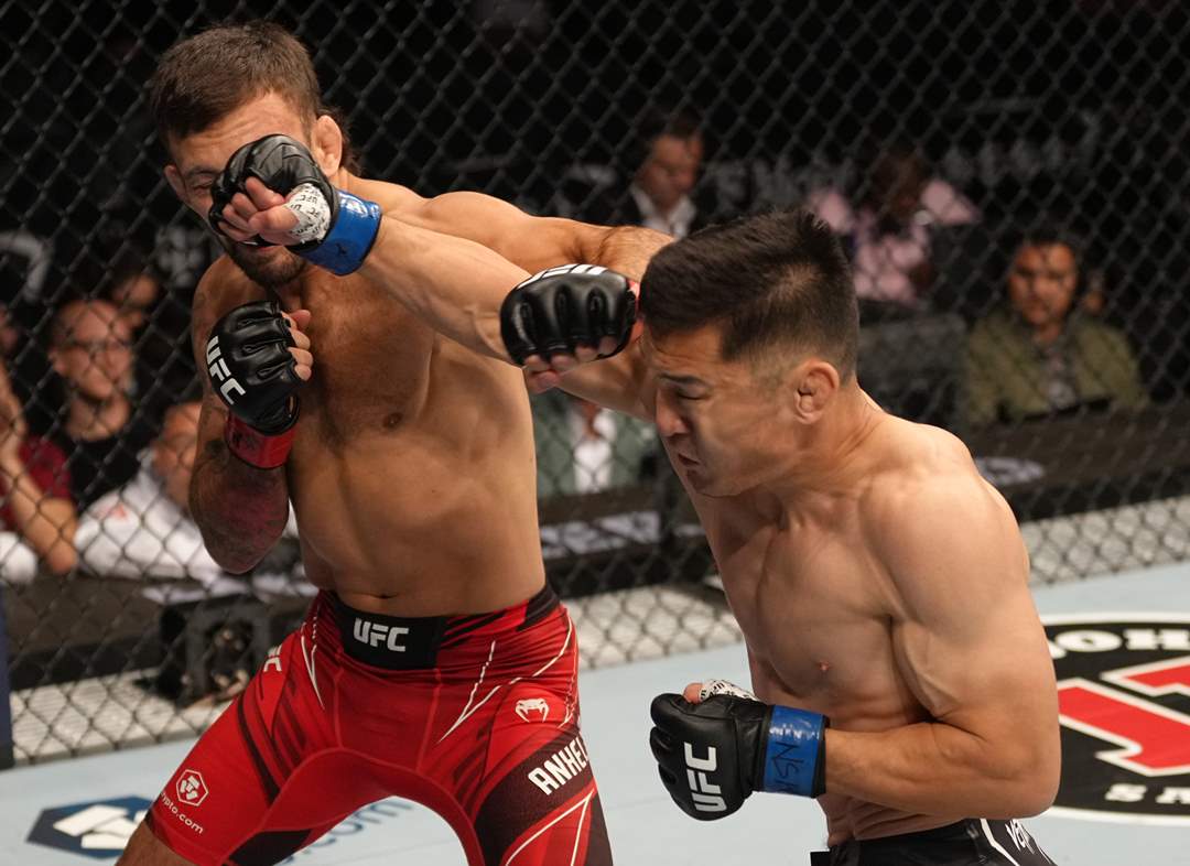 MMAS),虽然这是安海利格的第二场UFC比赛,不过这也是他职业生涯处于10连胜的状态。前两回合双方拳法对拼互有命中,第三回合阿拉腾黑力开局抱摔成功,随后两人继续战力对拼,回合最后1分钟阿拉腾黑力再次抱摔上位压制,最终三回合结束,阿拉腾黑力一(30-27、30-27、30-27)一致判定获胜,至此阿拉腾黑力在UFC的战绩为(4-1-1)。