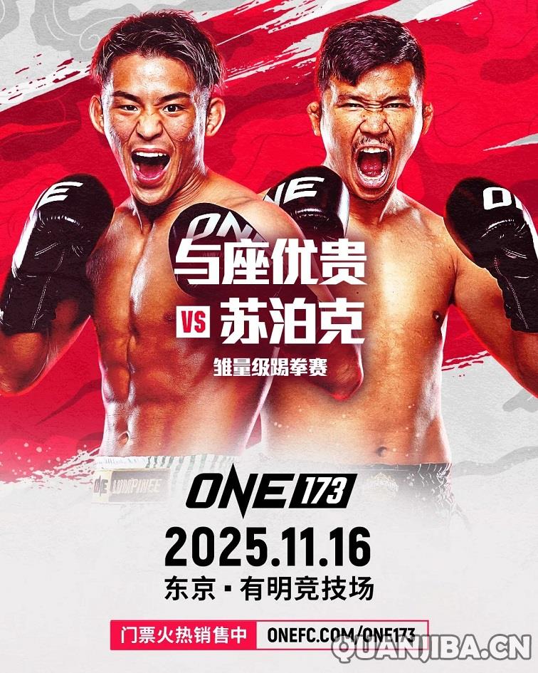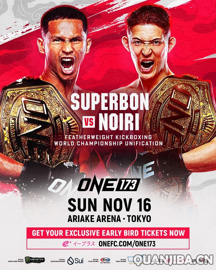 ONE冠军赛羽量级踢拳冠军统一战,现任冠军苏波邦(战绩116胜37负,29场KO)将对阵临时冠军野杁正明(战绩51胜12负,27场KO)。