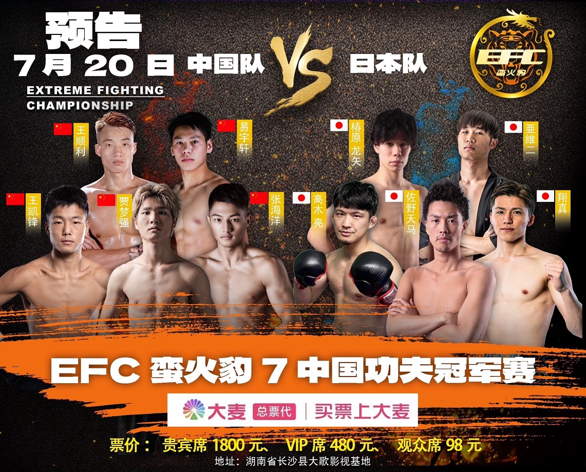 将于7月20日在中国长沙举行的EFC蛮火豹第7期赛事上,当天将进行5场中日对抗赛,日方阵容由前K-1羽量级(-57.5 kg)冠军椿原龙矢领衔出战,他将对阵来自长沙戈锐武将俱乐部的贾梦散打强。