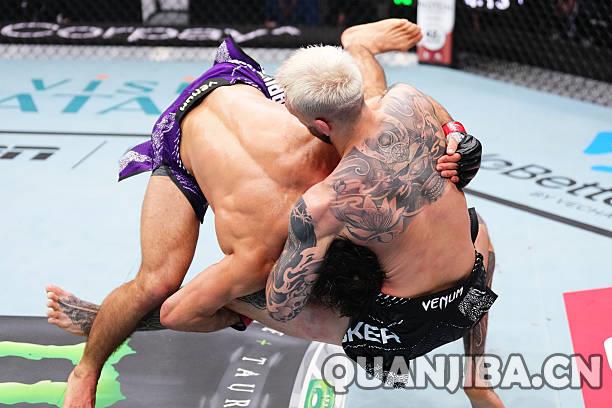 这场赛事的主赛是一场轻量级重头戏,头号挑战者阿尔曼·萨鲁基安(23胜3负,9次KO,6次降服)与排名第六的丹·胡克(24胜13负,11次KO,7次降服)交锋。从比赛一开始,萨鲁基安凭借强大的摔跤技术迅速占据上风,第一局成功进行了抱摔,而胡克试图反击却被他化解。第二局中,虽然胡克也尝试了断头台,但萨鲁基安巧妙地逃脱,运用压制战术恢复控制局面,最终在第二回合完成了手臂三角绞,成功降服对手,收获五连胜,毫无疑问,他将是下一个争夺冠军的热门人选。