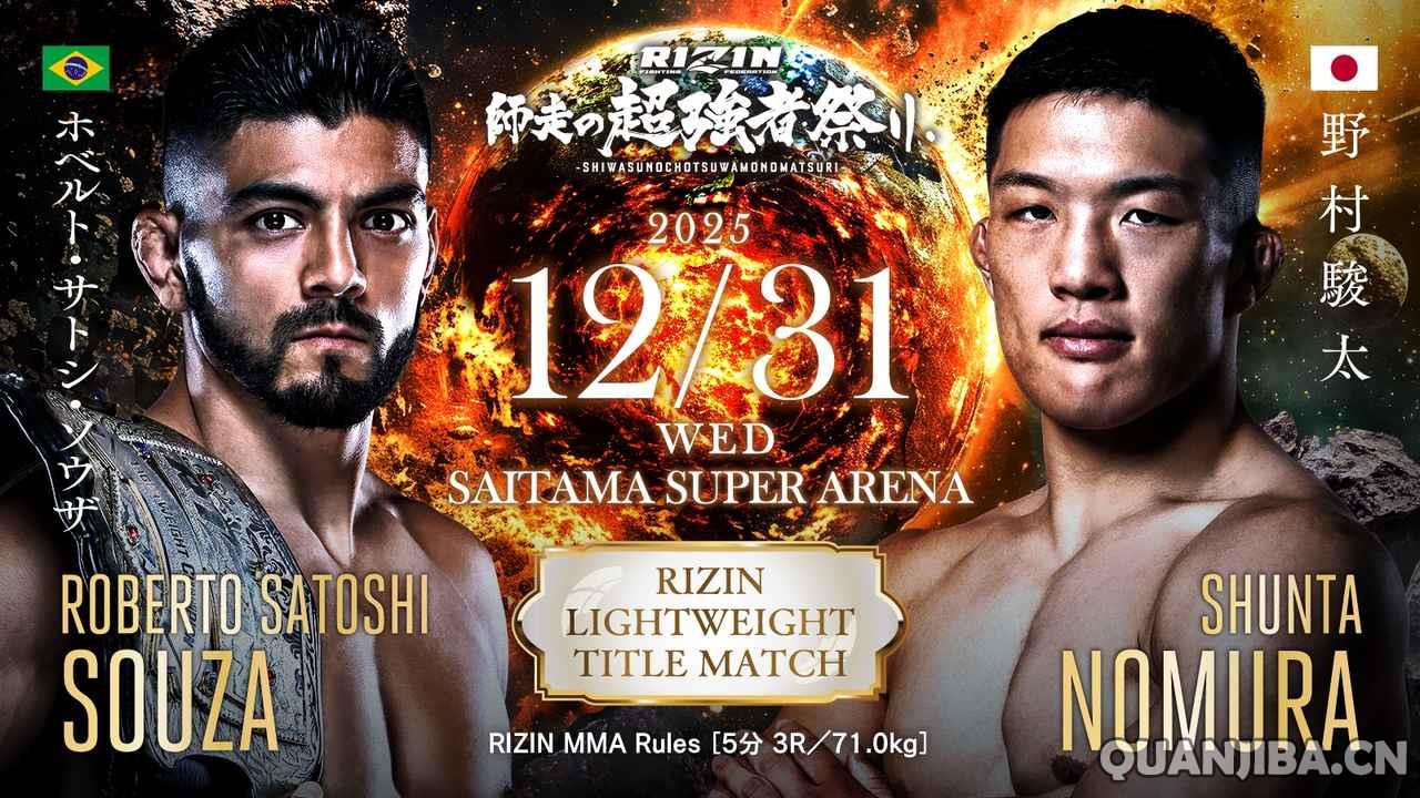 此外,RIZIN轻量级冠军争夺赛中,现任冠军罗伯托·德·索萨(Roberto de Souza)(20-3,6 K,13 S)将对阵挑战者野村骏太(Shunta Nomura)(10-2,4 K,0 S)。