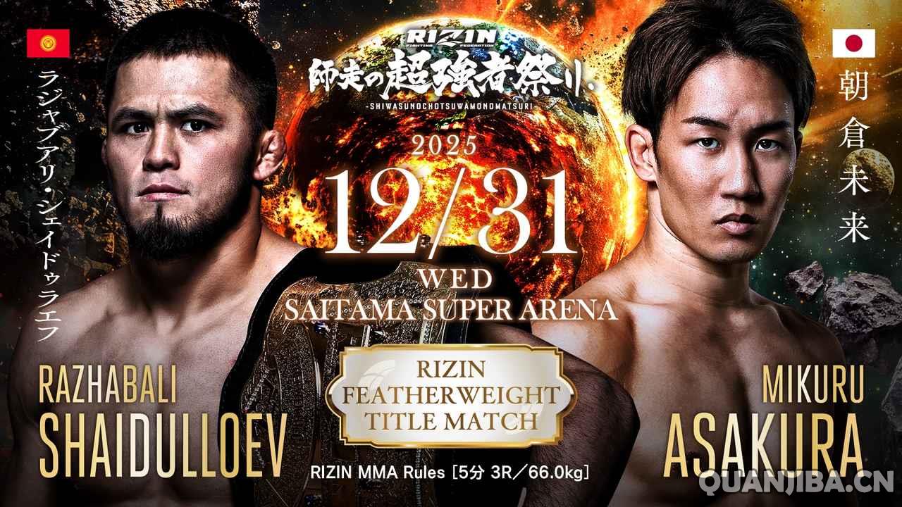 本次赛事将展示五场冠军争夺战,最受瞩目的无疑是RIZIN羽量级冠军争夺赛,现任冠军拉扎巴利·沙伊杜拉耶夫(Razhabali Shaidullaev)(15-0,7 K,8 S)将与挑战者朝仓未来(Mikuru Asakura)(19-5,9 K,1 S,1 N)展开激烈角逐。