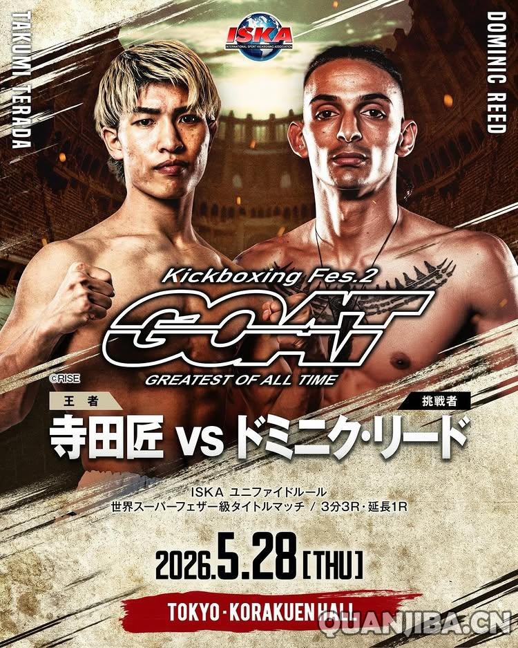 另一场ISKA超羽量级(-59kg)世界冠军赛,由现任ISKA金腰带拥有者、前K-1羽量级(-67.5kg)冠军寺田匠(Takumi Terada)(12-2,UFC 5 KO)对阵新西兰悍将多米尼克·里德(Dominic Reed)(39-19-1,19 KO)。寺田匠在2023年11月远征意大利夺得ISKA世界冠军殊荣,并于2024年续写传奇,加冕K-1羽量级桂冠,2025年还成功卫冕K-1散打头衔。最近他在RISE赛事惜败于安本晴翔,期待在这次格斗挑战中重振士气。